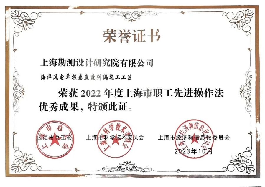 近日,在上海市總工會、市科委和市經(jīng)信委聯(lián)合開展的2022年度上海市職工合理化建議和先進(jìn)操作法優(yōu)秀成果征集命名工作中,三峽上海院深遠(yuǎn)海海上風(fēng)電建設(shè)關(guān)鍵技術(shù)科技創(chuàng)新團(tuán)隊(duì)(第一發(fā)明人:張權(quán))的“海洋風(fēng)電單樁垂直度糾偏施工工法”榮獲2022年度...